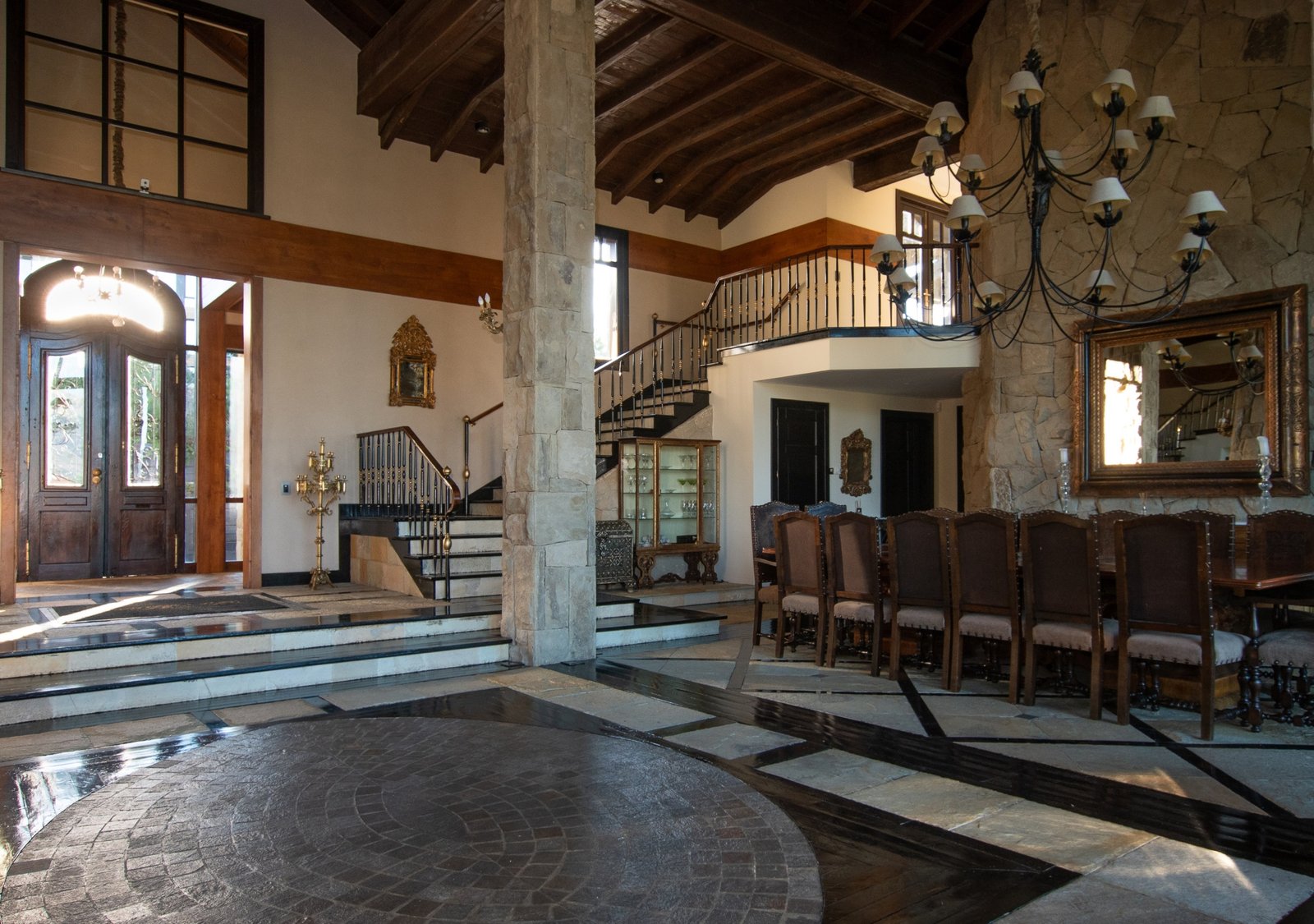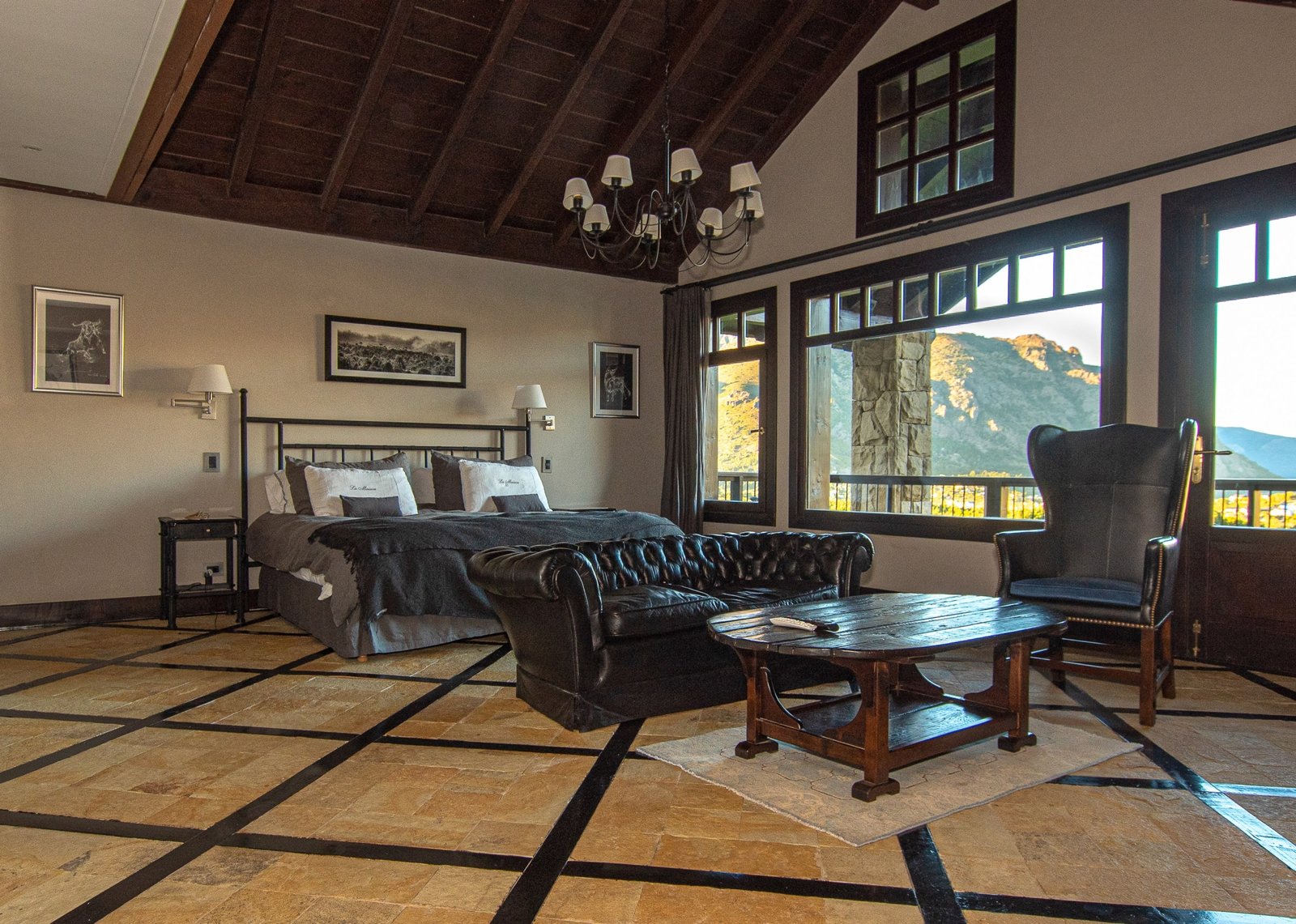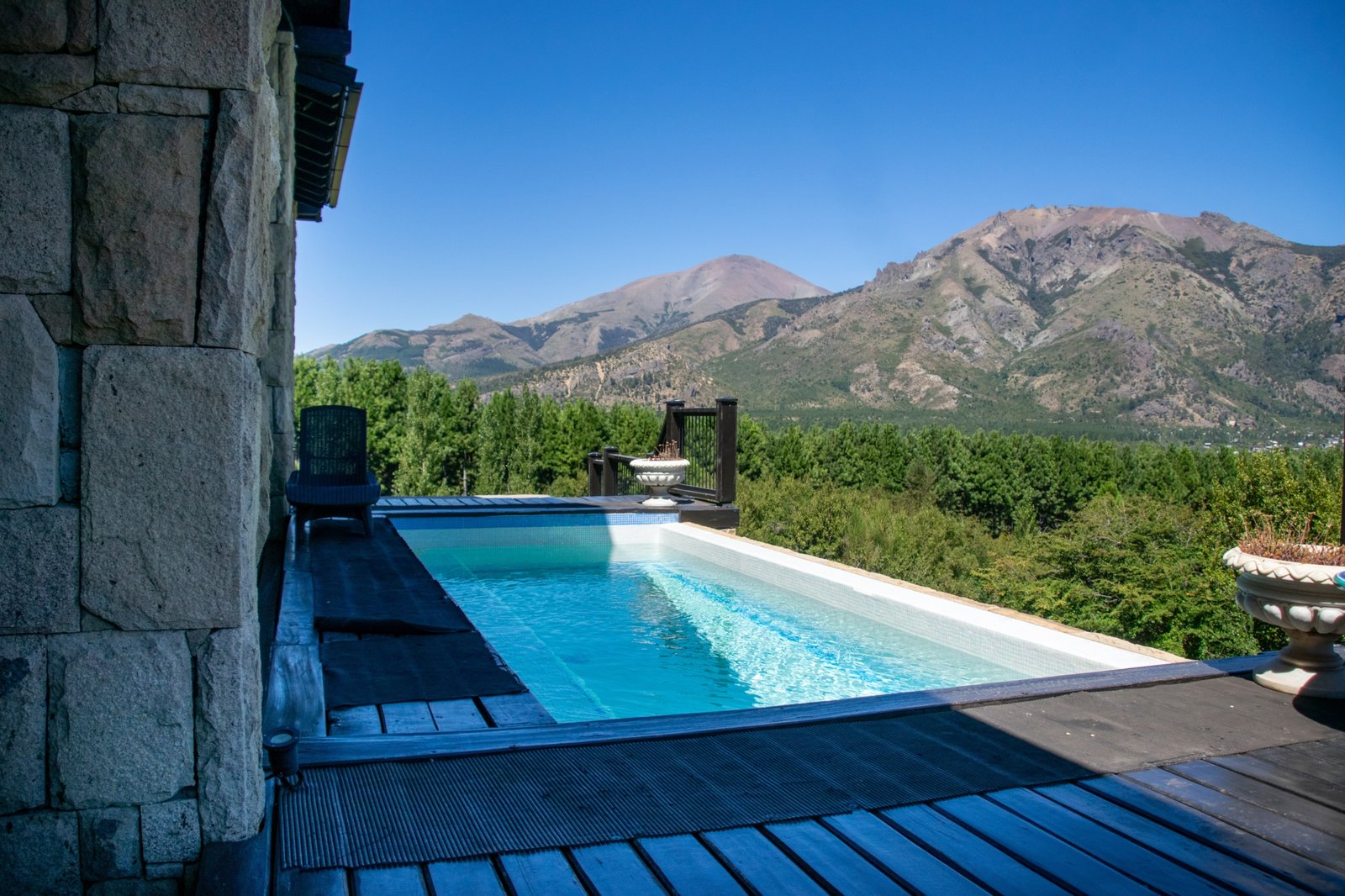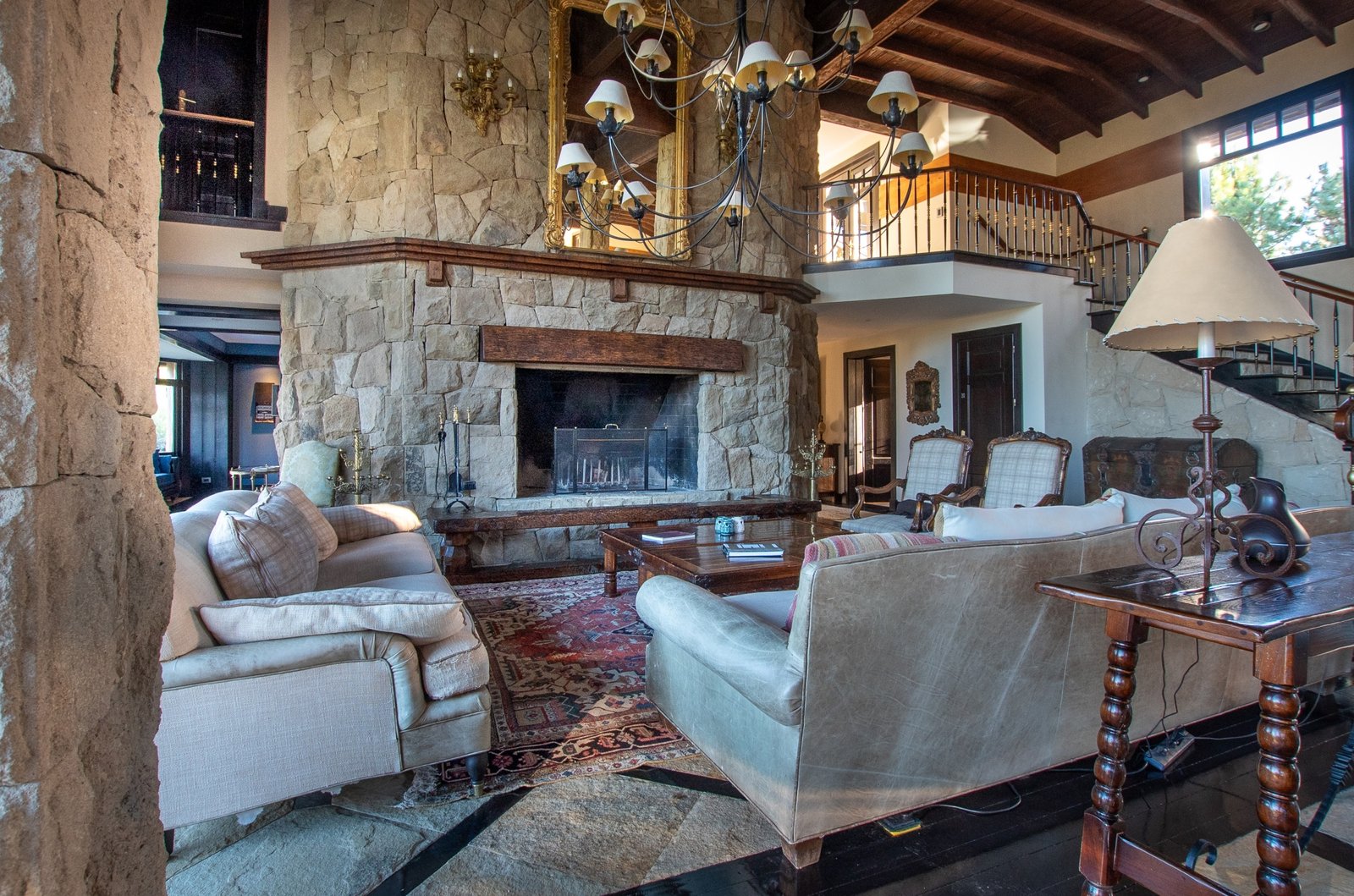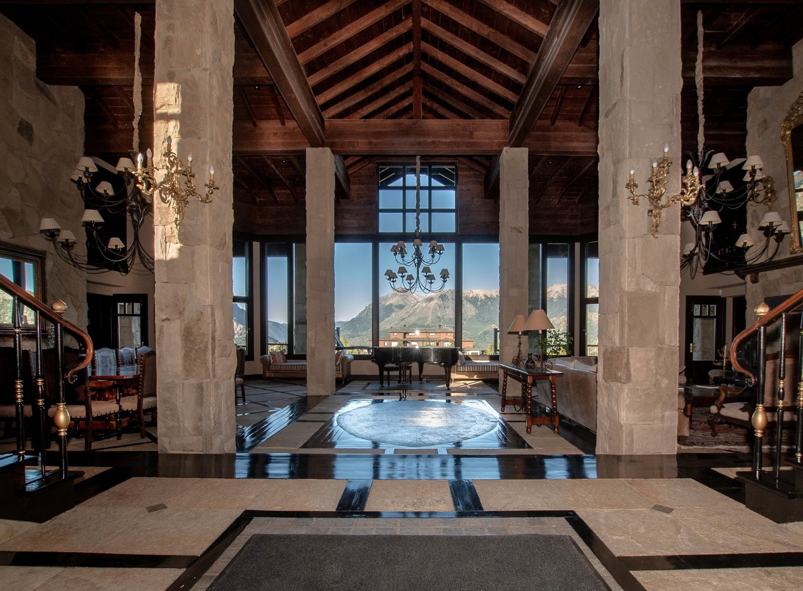 This exclusive residence is located within Arelauquen Golf& Country Club with stunning views of Cerro Catedral ski resort and polo fields from all rooms and its charming Patagonian-style construction using local stones and woods. Comprising over 7,000 sq. ft. with high wooden ceilings and stone floors with intricate designs in addition to the appeal and harmony of the space, it creates a truly spectacular ambiance. The main living room with its focal fireplace, creates a warm and inviting atmosphere, complemented by a generously sized dinning room capable of seating 16 guests includes a piano and two sofas near the front windows providing the perfect setting for social gatherings. A wooden external deck with a heated pool and sun loungers adds a luxurious touch, inviting relaxation and enjoyment of the stunning surroundings.